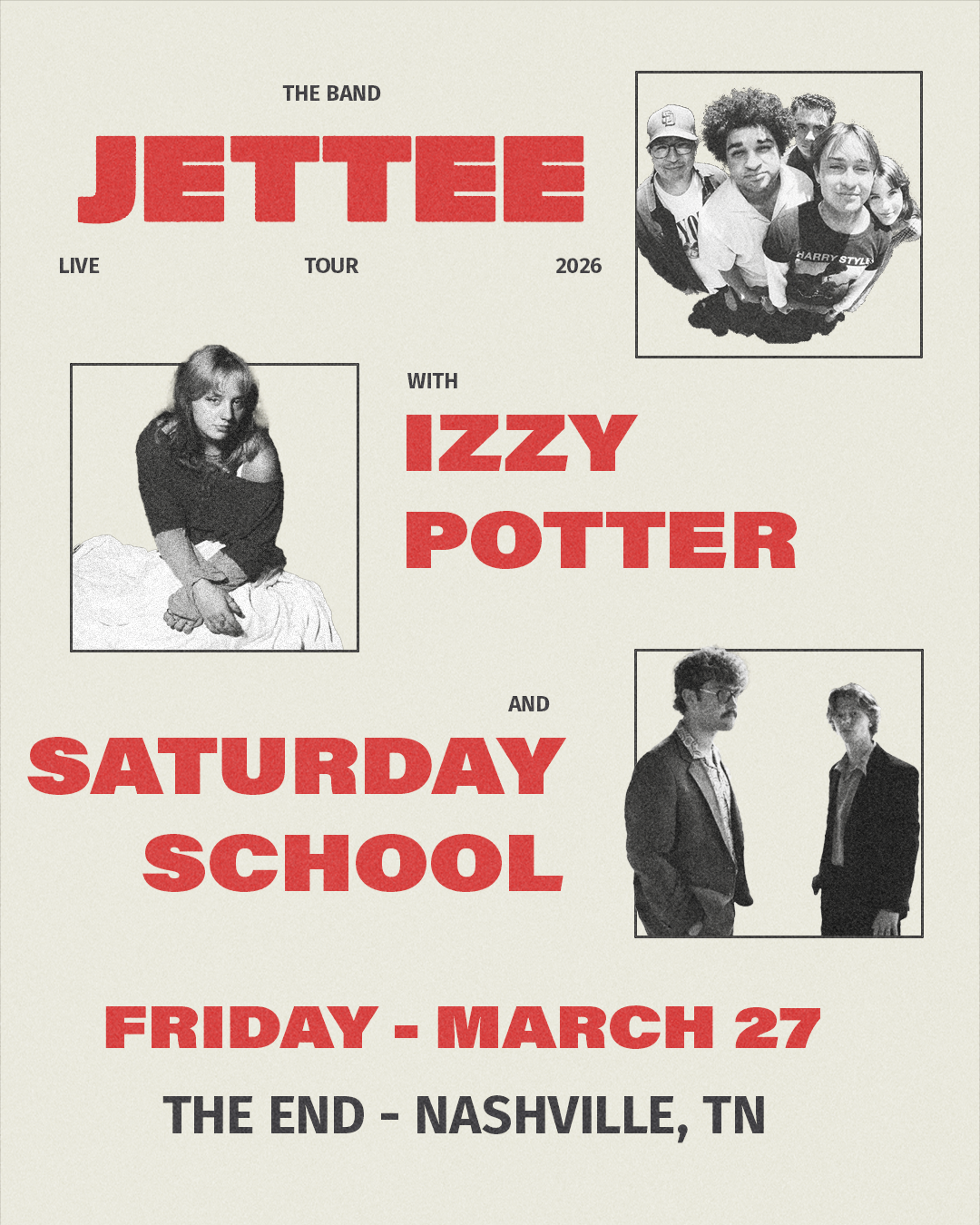 We are an indie rock band called Jettee and we are playing The End on Friday - March 27
